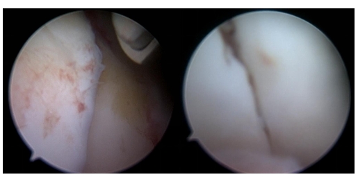 术中关节镜下显示关节面骨折线复位前后对比,可见关节外复位后,关节面基本平整,达到解剖复位。