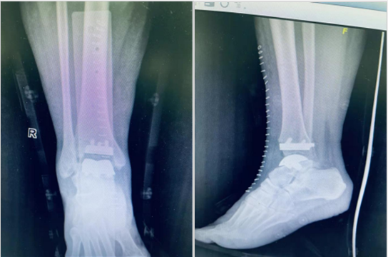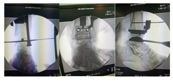 经过详细的术前分析,王文波教授、张涛副教授团队为李女士成功实施右侧全踝关节置换术,术中准确定位并置入踝关节假体,在成功松解软组织的同时又避免了血管神经结构的牵拉破坏,同时采用合适的假体,确保踝关节的稳定性,整个手术过程患者生命体征平稳。术后一周,患者康复出院。
