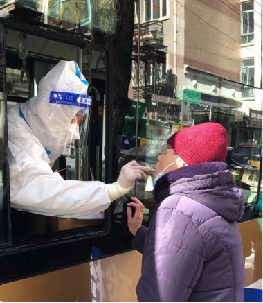 “比起帐篷下采集,流动车工作有一定难度。首先,在车里采集,采集者全程都是侧着身子;其次居民身高不同也增加了工作难度,尤其面对小孩时,需要采集者将身子探出车窗;还有居民面对咽拭子时会有后退的下意识动作,医护人员还得‘追’着采样,时间久了腰背都会酸痛。”别看胡影是年轻人,但却在抗疫战场显担当,6个小时,她便高效、准确地完成了采样1000余人次。