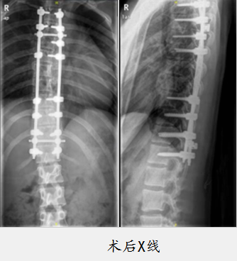 术中,董大明教授、关瑛副主任医师带领团队,以T3-T12为中心取后正中切口,在相应节段椎体安放椎弓根螺钉、金属棒,经过加压、植骨等步骤,胸椎生理后凸恢复,胸椎侧弯得以矫形,考虑到患者为14岁的女孩,董大明运用美容缝合,让刀口恢复后相对美观。术前侧弯角度(Cobb )为41度,术后0度,侧弯完全纠正,女孩整体状态良好。术后,骨科五病房张晓娟护士长带领护士结合ERAS理念,加速女孩术后康复,提高舒适度及满意度。
