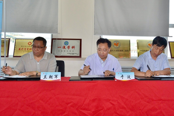 心内科主任于波、道里区人民医院院长兰朝军与道里区社区卫生中心主任签署三方协议建设心血管专科医联体