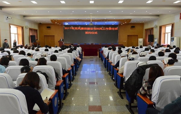 为进一步加强医院党风廉政建设,筑牢防腐拒变的思想防线,按照中央党风廉政建设主体责任制层层抓落实的原则和“一岗双责”的要求,3月20日下午15:00,ac米兰官网中文网站二院举行2017年党风廉政建设责任状签署仪式。医院党政领导班子成员、职能科室负责人、临床科室主任、护士长、党支部书记共200余人参加了会议。会上,院长与副院长代表、院长与临床科室主任代表、副院长与分管科室负责人代表依次签署《2017年党风廉政建设(反腐倡廉)工作和纠正行业不正之风工作目标责任状》,并部署会后科室主任与科室全体职工签署责任状事宜。会议由党委副书记王培军主持。