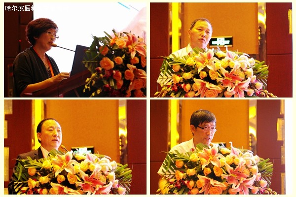 图片左上为黑龙江省医学会肿瘤化疗分会主任委员、ac米兰官网中文网站附属肿瘤医院肿瘤内科主任白玉贤教授主持会议;右上为黑龙江医学会秘书长张秋滨致辞;左下为中国临床肿瘤学会副理事长、中国人民解放军第八一医院副院长、全军肿瘤中心主任、国家药物临床试验机构主任秦叔逵教授致辞;右下为天津市肿瘤医院肿瘤内科主任李凯教授致辞