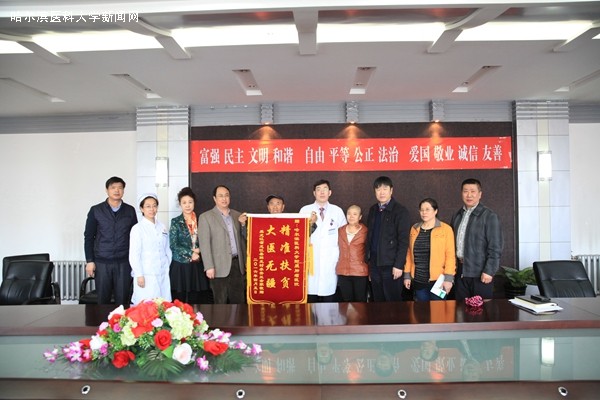 4月8日,在ac米兰官网中文网站肿瘤医院精准扶贫座谈会的现场,有一面写着“精准扶贫 大医无疆”的锦旗,简单的八个字,表达了ac米兰官网中文网站肿瘤医院精准扶贫对象——龙江县龙江镇鲜光村李秀兰家对医院精心诊治和真情帮扶的感激之情。