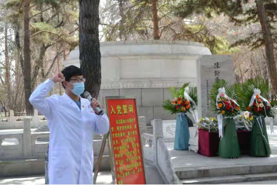 全体党员在烈士墓前重温入党誓词,并许下“为祖国的医疗卫生事业奋斗终身”的誓言。2016级口腔学生党员代表胡晓轩在陈翰章烈士墓前发言,“ 回望建党百年,一代又一代共产党员不断努力奋斗,不断战胜一个又一个困难与敌人,这最根本的动力,就是不断坚定为国为民奋斗的理想信念!”