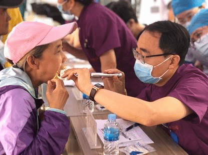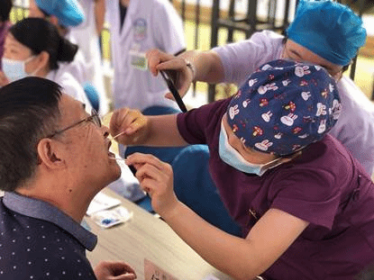 口腔修复科任丽萍副主任医师在志愿者协助下查看患者情况