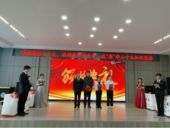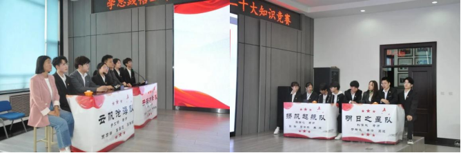 决赛中,每个队伍的演讲激情澎湃,饱含对党的敬仰与深情。他们讴歌党的丰功伟绩,展现青年学生的使命担当;他们表达对祖国的赤诚热爱,坚定跟党走的不移信念。在激动人心的答题环节,四组队伍分别选出一名教师、一名研究生和两名本科生参加比赛,在“谁与争锋”、“激流勇进”、“扭转乾坤”三个答题环节中,选手积极拼手速、拼脑力,沉着冷静、认真作答,充分展现了学院师生扎实的政治理论功底。同时,四组选手用朗诵、歌曲、舞台剧等多种表演形式,使党的二十大精神生动形象,提升理论学习的多元化。