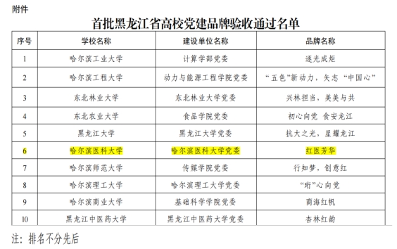 学校党委结合百年红色传承和医学专业特色,总结凝练出“红医芳华”党建示范品牌,于2023年3月成功入选黑龙江省首批高校党建品牌培育创建名单,并于2024年7月顺利通过答辩验收。