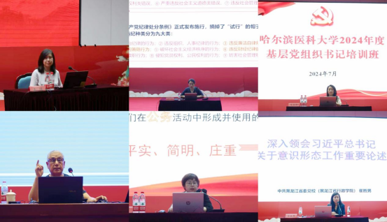 本次培训班精心设计了专题辅导讲座、分组交流研讨、个人自学和学员论坛等多种教学形式,以确保集中学习取得实效。在培训班上,省委党校哲学教研部崔胜男教授以《深入领会习近平总书记关于意识形态工作重要论述》为题,深入鲜活的讲述了习近平总书记关于意识形态工作重要论述的科学内涵、本质要求和重大原则;省国家保密局宣传法规处副处长王倩以《增强保密意识,履行保密责任,做好新时代新征程保密工作》为题,帮助全体学员持续强化做好新时代保密工作的责任意识和本领能力;学校马克思主义学院院长李中华以《红医颂芳华,信念铸千秋—<中国共产党纪律处分条例>解读》为题,系统全面的讲述了《中国共产党纪律处分条例》的修订意义、主要内容和贯彻落实的具体做法;省委党校党史党建教研部宋艳玲教授以《中国共产党支部工作条例(解读)》为题,详实具体的讲述了党支部标准化规范化建设的重要意义和主要做法;黑龙江省军区原副司令员金恩祥将军以《践行总体国家安全观,勇敢面对中美博弈的惊涛骇浪》为题,深刻透彻的讲述了中美关系现状、趋势、根源与实质;哈尔滨师范大学文学院罗曼教授以《常用公文文种写作规范及技巧》为题,深入浅出的讲解了常用公文的写作技巧和处理要点。