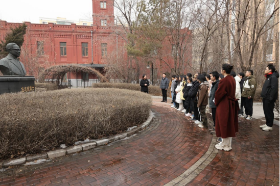 活动开始,全体师生在伍连德博士铜像前举行庄重的献花仪式。学生代表神情肃穆,缓步向前,将手中的鲜花轻轻放置在铜像前,全体肃立,向伍连德博士铜像鞠躬,表达对先驱的深切敬意。