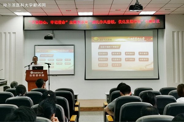 基础医学院党委在基础医学院三楼演讲厅召开“不忘初心、牢记使命”主题党课暨“深化作风整顿,优化发展环境”专题会议。学院各党支部书记、学科主任、全体机关干部及乔远东书记联系点支部全体党员共同聆听了主题党课和专题报告。