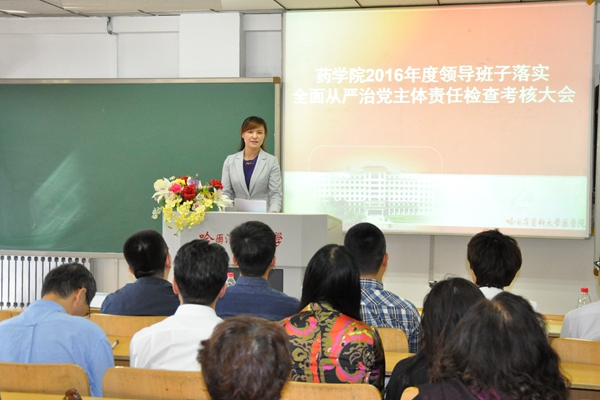 5月17日下午,药学院在十四号教室召开2016年度领导班子落实全面从严治党主体责任检查考核大会。学校党委考核组一行六人莅临药学院,组长由学校组织部部长王小雪同志担任,校党办副主任孙理、纪检监察处副处长刘进、组织部副部长张修明、宣传部副部长迟沫涵、纪委遇时一同参与考核。