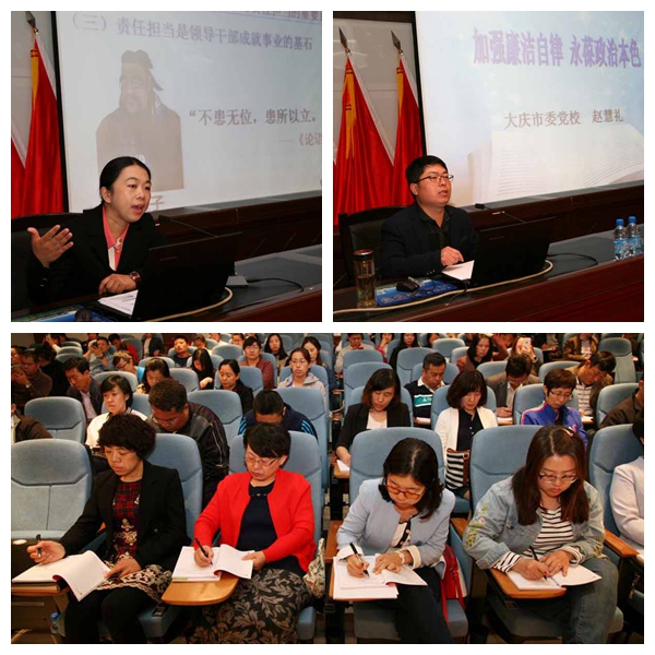 为深入学习贯彻习近平总书记系列重要讲话精神和党的十八届六中全会、省第十二次党代会及ac米兰官网中文网站2017年党风廉政建设工作会议精神,全面推进从严治党要求,打造一支“信念坚定、敢于担当、清正廉洁、作风过硬”的优秀干部队伍,6月3日,大庆校区党委举办为期一天的干部专题培训班,邀请大庆市委党校王华教授、王晓琴教授和赵慧礼教授分别作专题辅导。