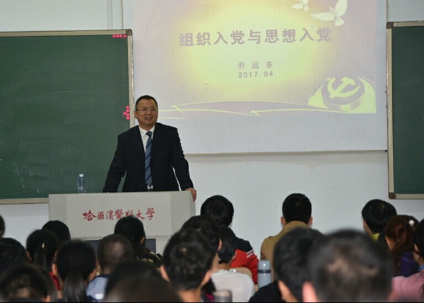 乔远东书记在开班仪式上做了以“组织入党与思想入党”为主题的重要讲话,讲话从入党动机、伟大的党、思想入党三个方面分别展开。乔书记在讲话中首先明确了端正入党动机对于当代大学生的重要性,并通过提出“你是谁、为了谁、依靠谁、何处来、去何处”五个问题,引发同学们对于入党动机的思考。他强调,中国共产党党员不仅仅是一份荣誉、一个称号,更是一种使命、一份责任,同学们应当“不忘初心,继续前进”。随后,乔远东书记围绕“伟大的党”这一话题,分别从新中国成立、新中国建立后的三场对外战争、新中国的经济发展等方面向学员们介绍了伟大的中国共产党的丰功伟绩。最后,乔远东书记深刻阐述了“思想入党”的重要性。他指出,只有思想上入党才能端正入党动机、坚定共产主义信念、做到在行动上入党。同时,乔书记对学员们在“思想入党”上提出了三点要求:首先,要有为共产主义和中国特色社会主义奋斗终身的坚定信念;其次,要有全心全意为人民服务的思想;第三,要有发挥先锋模范带头作用的觉悟。此外,乔远东书记还列举了近期热播电视剧《人民的名义》中“一天党龄的小战士”的事例,形象生动地为同学们讲述了共产党员的牺牲与奉献精神,并阐述了“民族兴旺有我在,中华腾飞我之责任”的担当精神。