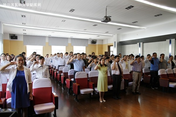 大会在庄严雄壮的国歌声中拉开了序幕,学生党总支书记王冶艳宣读了参加宣誓的党员名单,由党办主任刘文慧带领40名新党员举起右手,在党旗下庄严宣誓;到会的全体老党员也再次面向党旗庄严宣誓,重温了入党誓词。研究生党总支副书记、业务综合办公室主任王琪代表老党员进行了大会发言,她向刚刚加入党组织的新党员表示了祝贺,并且提出了殷切的希望。新党员和积极分子代表也分别进行了发言。新党员代表院刊《露华》主编、2013级管理专业张天宇同学表示,将以今天为起点,以党员的标准严格要求自己,牢记入党誓言,在今后的学习、工作和生活中,时时处处发挥党员的先锋模范作用。积极分子代表2014级预防医学二班班长、学生会副主席张嘉鹏同学表示将以老党员为榜样,以实际行动争取早日加入党组织。