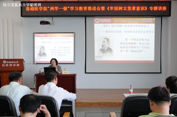 为了更好地推动“两学一做”学习教育,使全体党员干部深刻领会党章的丰富内涵,基础医学院继5月9日召开“两学一做”学习教育启动大会后,于5月31日下午在学院三楼报告厅成功举办了“两学一做”学习教育推进会暨《牢固树立党章意识》专题讲座, 特邀中共黑龙江省委党校、行政学院党史党建教研部副主任孙艳春教授授课。学院领导班子、各党支部委员、学科主任、博士生导师、机关干部及学生年级老师全体参加了学习。学校宣传统战部副部长迟沫涵出席了讲座。会议由学院党委书记乔远东主持。