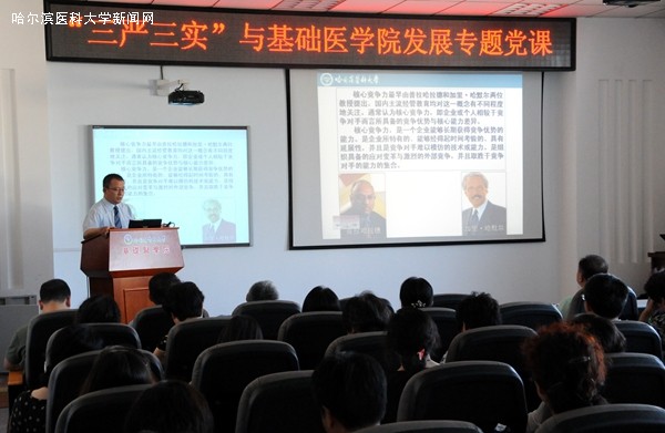7月15日下午,按照学校党委关于开展“三严三实”专题教育的总体部署和要求,基础医学院党委书记乔远东同志在基础医学院多功能讲演厅上了一堂题为《“三严三实”与学院发展》的专题教育党课。学院党政领导班子成员,各学科主任、副主任、党支部书记,全体行政管理干部共 60余人参加了学习活动。