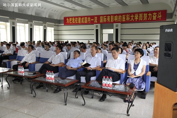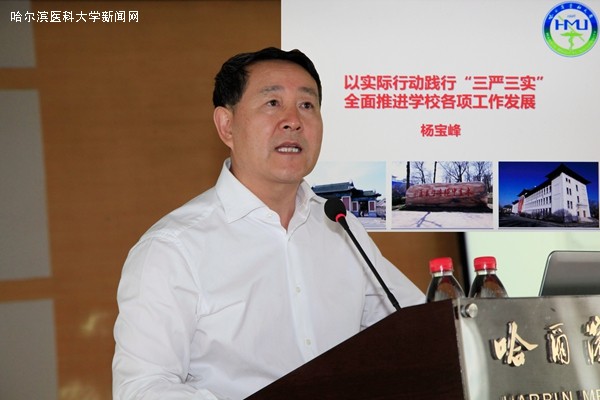 杨宝峰校长依据国情大势,结合自身多年的学习经历和工作体会,生动客观地阐释了“三严三实”的重要意义和深刻内涵。“三严三实”专题教育贵在落实、重在践行。杨宝峰校长牢牢把握住这个关键点,从人才队伍建设、学科建设、教学改革、科学研究、医疗服务、研究生教育、国际交流等七方面核心工作,精炼总结、准确剖析了过去三年, 学校取得的成绩、面临的困难和发现的问题。杨校长通过对学校发展历程的追溯,让与会同志深切感受到“严”的精神、“实”的作风是推动学校各项事业发展进步的不竭动力。凭借对学校工作的全面把握、深刻了解和深入思考,杨校长本着实事求是的态度,指出了未来发展建设中,我们所要面临的困难和亟待破解的瓶颈问题。杨校长指出,团队建设、人才建设、岗位设置工作、中俄研究所工作、科研基金项目建设、加大于维汉院士杰出青年培养基金项目和伍连德青年科学基金项目的投入将是我们今后一个时期要重点做好的工作。这就更需要全校党员干部要以上率下、以身作则,按照“严”的精神,“实”的要求,脚踏实地地推进学校教学、科研、医疗、管理等各项工作。