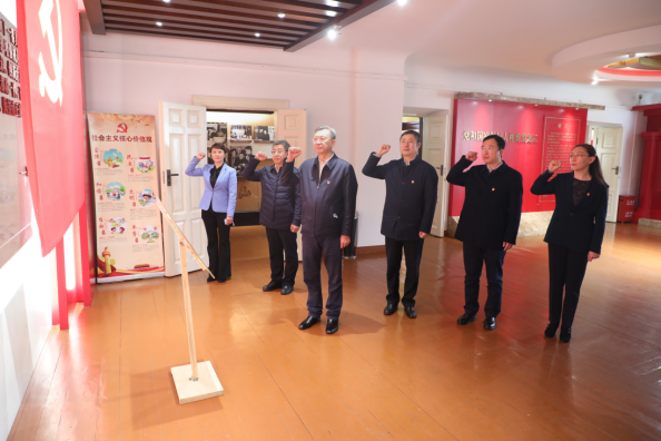 班子成员在讲解员的引领下认真听取讲解,参观中国共产党成立至今各个时期的真实史料、珍贵照片。伫立在历史照片、文物和题词前,一起回顾党和国家领导人对黑龙江的亲切关怀,接受革命传统教育和党性洗礼。参观过程中,同志们时而凝神倾听,时而驻足观看。在一楼展厅前,面对鲜红的中国共产党党旗,张斌带领班子成员们重温入党誓词,以坚定有力的宣誓声,表达时刻不忘初心、矢志永远奋斗的信念和决心。