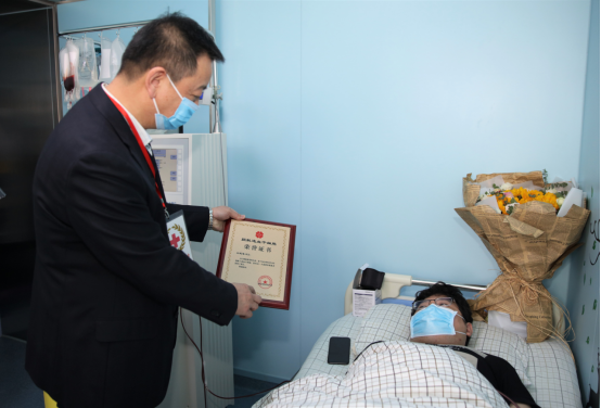 黑龙江省红十字会副会长郑海滨为刘思远送上捐献证书和鲜花,赞扬他大爱无疆的奉献义举,体现了“人道、博爱、奉献”的红十字精神,是当代大学生中的楷模。刘思远不仅挽救了一个人,更是挽救了一个家庭,希望他积极加入到造血干细胞捐献的志愿者队伍中,为红十字事业贡献一份力量。