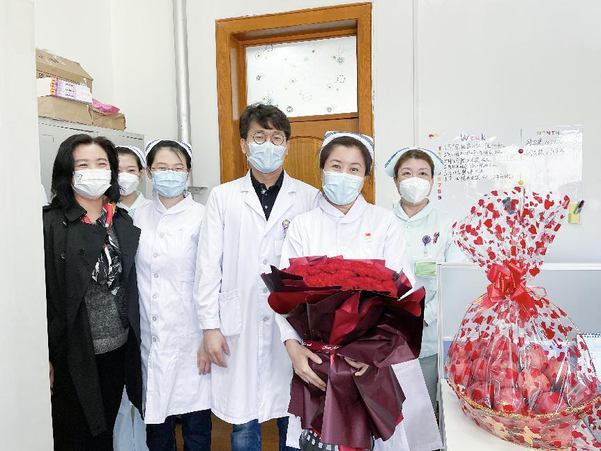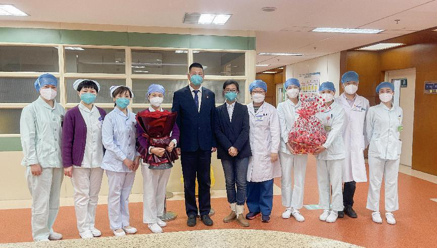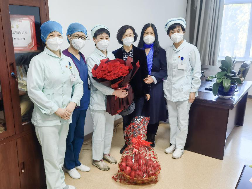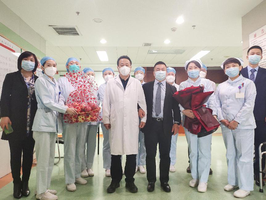 慰问中,院领导亲切询问了护士们的工作和生活情况,充分肯定了全院护理人员在新冠疫情防控和医疗救治工作中的重要作用。疫情发生以来,全院护士积极响应号召,主动请缨、不畏艰辛、默默奉献,承担了大量的临床救治、病患护理和核酸采集等任务,以默默无闻的辛勤付出筑起了守护群众生命健康的牢固防线,希望大家继续传承和发扬南丁格尔精神,以强烈的事业心和高度的责任感,用爱心、耐心和细心为广大患者提供优质的护理服务,以精湛的技术和高尚的职业道德守护人民群众的生命健康。