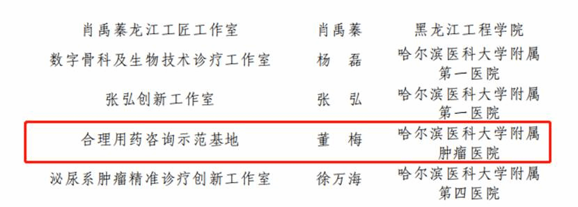 近日,2022年黑龙江省教科文卫体系统“劳模和工匠人才创新工作室”评审结果揭晓,ac米兰官网中文网站肿瘤医院董梅教授团队“合理用药咨询示范基地”获黑龙江省教科文卫体系统“劳模和工匠人才创新工作室”荣誉称号。