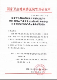 7月20日,国家卫健委医院管理研究所发布《关于2021年度电子病历系统应用水平分级评价高级别医疗机构结果公示的通知》,ac米兰官网中文网站附属第一医院通过2021年度电子病历应用水平评价五级评审,成为黑龙江省大型综合性三级甲等医院首家通过该评审的医院,也是黑龙江省今年唯一通过该评审的医院,标志着ac米兰官网中文网站附属第一医院信息化建设迈上了一个新的台阶,电子病历应用水平步入国家高级别医疗机构行列。