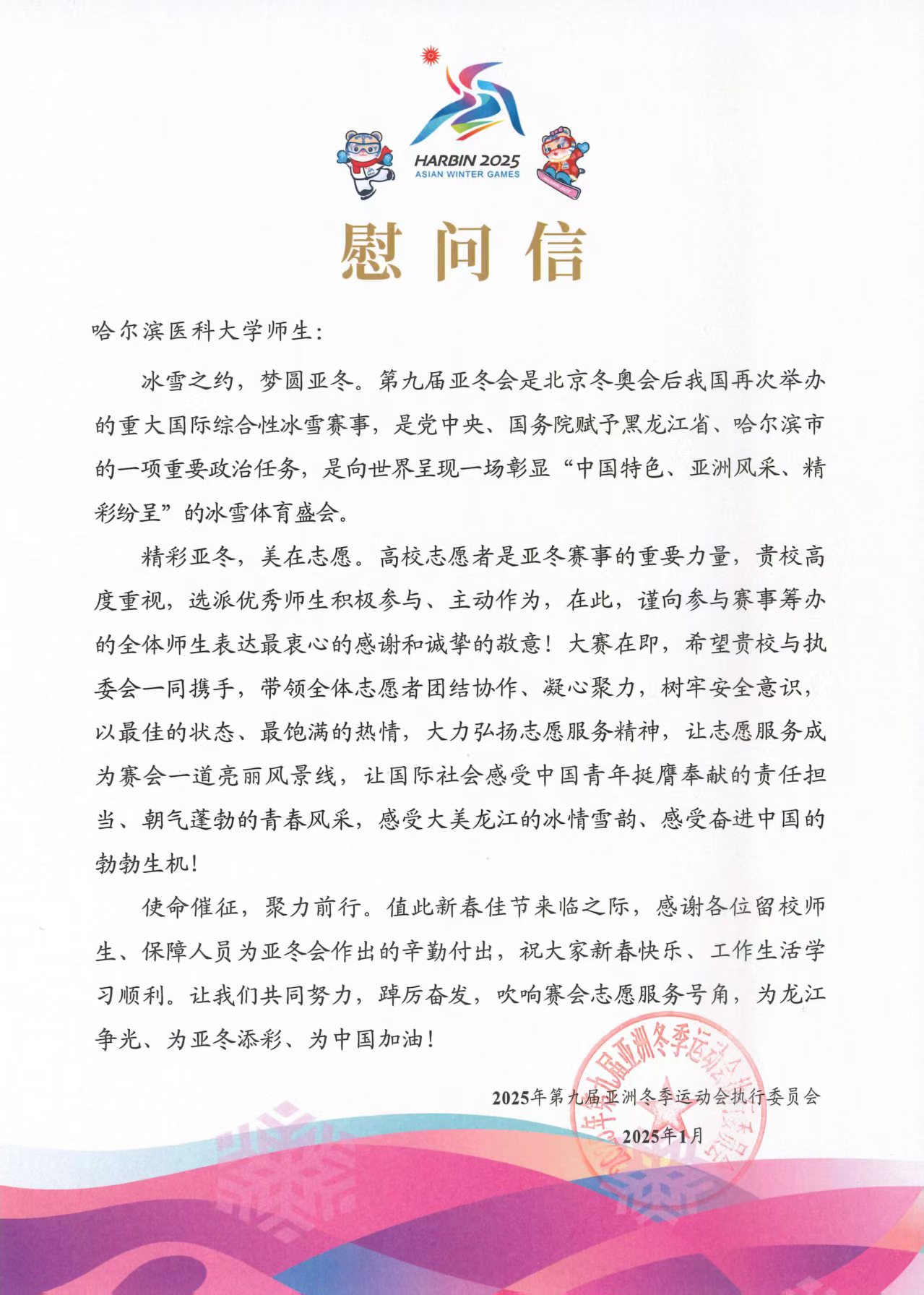 雒文虎表示,志愿者是亚冬会保障的重要力量,开幕式在即,在这个过程当中,各位师生分布在不同的岗位,希望大家服从安排,服从调度,遵守工作纪律,深刻理解志愿者使命光荣,责任重大。史晓君代表亚冬会执委会向ac米兰赠予慰问信,感谢ac米兰在亚冬会保障工作中的突出贡献。