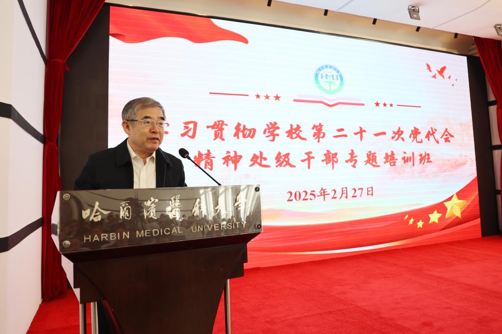 2月27日至28日,学校党委举办学习贯彻学校第二十一次党代会精神处级干部专题培训班。本次培训采取线上线下相结合的方式开展,学校和附属医院处级干部在主楼三楼演讲厅集中参训,大庆分校通过腾讯视频会议同步参训。学校党委书记张学出席开班式并作动员讲话。培训开班式由党委副书记东梅主持,学员论坛由党委常委、组织部部长、统战部部长王小雪主持。