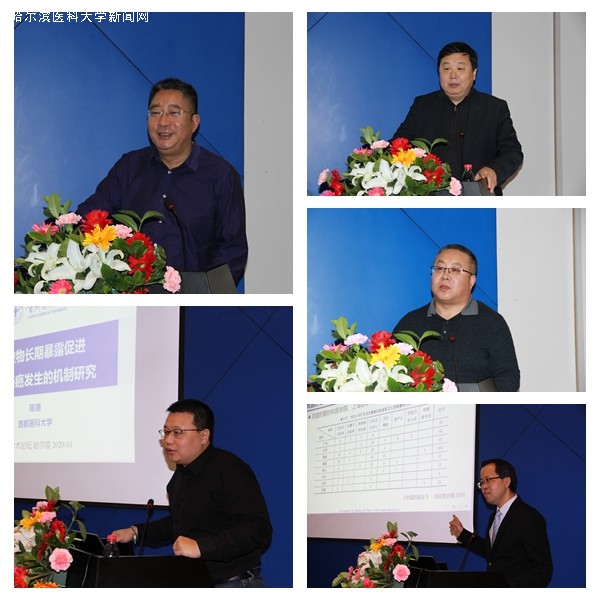 华中科技大学同济医学院公共卫生学院院长邬堂春(左上)、首都医科大学公共卫生学院院长陈瑞(左下)、天津医科大学公共卫生学院院长汤乃军(右上)、山西医科大学公共卫生学院院长王彤(右中)以及南京医科大学公共卫生学院副院长王建明(右下)作学术报告