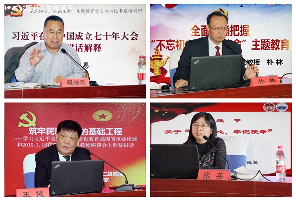 省社会主义学院祝福恩教授,省委党校周英东、朴林、张英教授,长春市委党校王健教授应邀围绕深入学习习近平总书记在“不忘初心、牢记使命”主题教育工作会议上重要讲话精神、《习近平关于“不忘初心、牢记使命”重要论述选编》、习近平总书记在深入推进东北振兴座谈会上重要讲话和对我省的重要讲话重要指示精神、习近平总书记关于教育的重要论述、习近平总书记在新中国成立七十年大会重要讲话精神等内容进行了系统辅导。