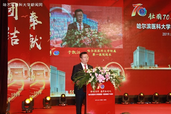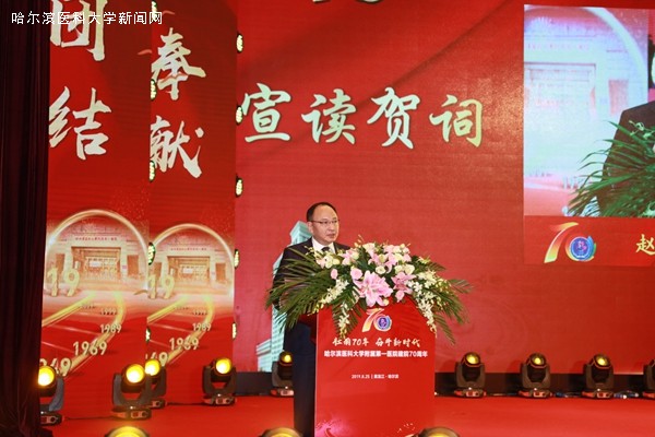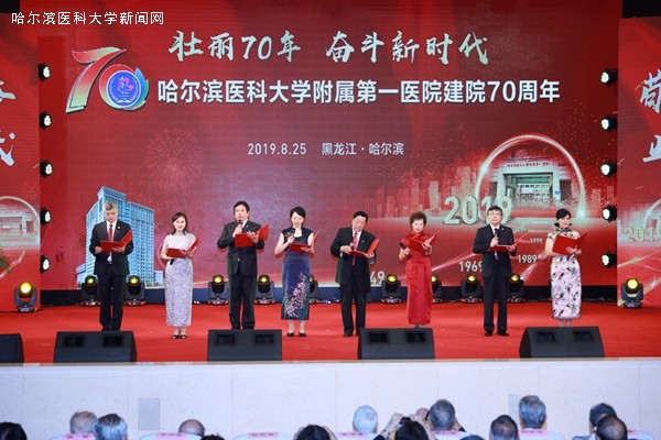 为了庆祝建院70周年,ac米兰官网中文网站附属第一医院于8月25日上午在学术报告厅隆重举行了“壮丽70年、奋斗新时代”大型庆典活动。活动现场,高朋满座、欢聚一堂。国家卫健委医政医管局局长张宗久,中国工程院秘书长白玉良,黑龙江省人大常委会副主任谷振春,黑龙江省人民政府副省长孙东生,中国工程院院士杨宝峰,中国工程院院士张英泽,中国工程院院士于金明,黑龙江省人力资源和社会保障厅厅长黄迎新,黑龙江省卫健委主任,黑龙江省医疗保障局局长齐峰,黑龙江省卫生健康委员会副主任、保健局局长刘福生,黑龙江中医药大学党委书记王福学,齐齐哈尔医学院党委书记顾长虹,牡丹江医学院党委书记关利新,牡丹江医学院院长朱晓峰,ac米兰官网中文网站党委书记张斌,北京大学医学部副主任姜保国,北京大学第一医院院长刘新民,中华口腔医学会会长俞光岩,郑州大学第一附属医院院长刘章锁,中南大学湘雅二医院院长周智广,浙江大学医学院附属第二医院院长王建安,中国医科大学附属第一医院党委书记王振宁,吉林大学白求恩第一医院党委书记佟成涛,中华医学会重症医学分会候任主任委员陈德昌,中华医学会物理医学与康复学分会主任委员岳寿伟等领导和嘉宾出席了庆典活动。