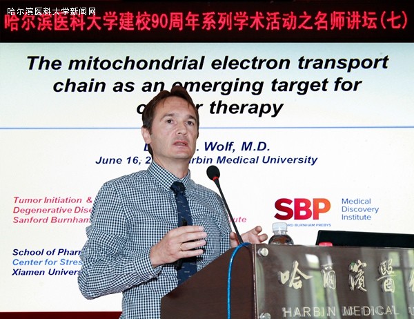 Dieter A. Wolf教授的讲座题目是The mitochondrial electron transport chain as an emerging target for cancer therapy,首先介绍了以前列腺癌细胞中p27 蛋白稳定性为指标,筛查了一系列小分子化合物,发现化合物SMIP004及其能通过抑制细胞中p27 蛋白降解,从而阻滞细胞周期进展,诱导细胞凋亡。随后,Wolf教授研究组又分析了SMIP004 的化合物分子机制,发现它能下调前列腺癌细胞的雄激素受体表达,并抑制线粒体中电子转移复合体I的功能。Wolf教授的SMIP004系列研究为肿瘤由信号传导机制到临床药物研发研究模式树立了精彩的样板,引起了师生们热烈的反响。
