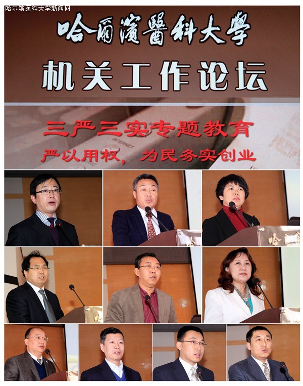 本次论坛活动在第三阶段各组学习研讨的基础上,由第三组9个部门的代表:医科院办公室刘凤玉主任,国际教育学院张明宇院长,图书馆曲章义馆长,武装保卫处李光处长,国际交流处副处长、国际教育学院副院长杨丹,医务处朱孔东副处长,科技产业处岳鹏副处长,国资办刘刚副处长,学校办公室刘心平副主任进行了主题发言。他们结合各部门的工作职责、工作特色,深入交流了对“严以用权,自觉做到谋事要实、创业要实”的理解和认识,重点研讨如何坚持用权为民、树立正确的政绩观、务实创新开展工作等问题,认真找到工作差距、明确努力方向、促进整改取得实效,取得很好的交流学习效果。