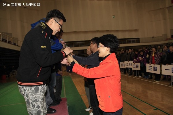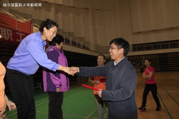 经过一天小组赛、淘汰赛的激烈角逐,最终附属五院、大庆校区、附属四院、基础医学院分别获得男子团体第一名、第二名、第三名、第四名,附属三院、附属四院、附属五院、附属二院分别获得女子团体第一名、第二名、第三名、第四名。在个人项目中,校部后勤张文博、基础学院许峰、附属二院王新涛分别获得青年男子组单打第一名、第二名、第三名;附属三院贾纯、附属三院王辉、附属五院卢萍分别获得青年女子组单打第一名、第二名、第三名;附属四院范春江、大庆校区刘少壮、附属五院赵法章分别获得老年男子组第一名、第二名、第三名;基础学院姜玉梅、附属四院胡东科、附属二院陈忠霞分别获得老年女子组单打第一名、第二名、第三名。在专家组比赛中,附属五院赵法章、附属一院曹继晨、药学院杨宝峰、校直机关刘凤玉分别获得男子组比赛第一名、第二名、并列第三名;药学院杜智敏、附属五院刘志梅、基础学院田淑君、公卫学院王丽敏、公卫学院周晓蓉分别获得女子组比赛第一名、并列第二名、并列第三名。在闭幕式上曹德品副校长,马宏坤书记,杨平主席为获奖队员颁发了奖杯和荣誉证书。
