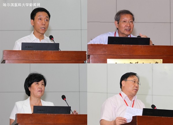 左上为傅松滨副校长致开幕辞,左下为李霞院长主持会议开幕式,右上为陈润生院士做大数据与精准医学特邀报告,右下为李亦学教授代表会务组致辞