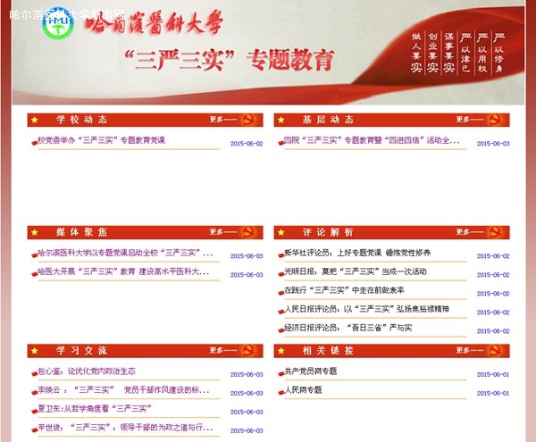 ac米兰官网中文网站“三严三实”专题网(http://hmucms.hrbmu.edu.cn/syss/)设置了五个栏目,分别是学校动态、基层动态、媒体聚集、评论解析和学习交流。另外,还在该网页链接了共产党员网专题和人民网专题,以方便师生们了解更多关于“三严三实”的信息。