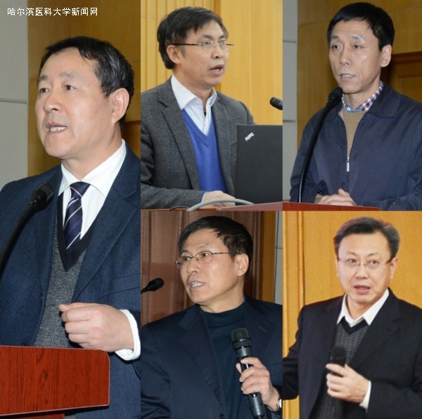 左一杨宝峰校长,上左曹德品副校长、上右傅松滨副校长、下左刘文川副校长,下右张斌院长分别讲话或作报告