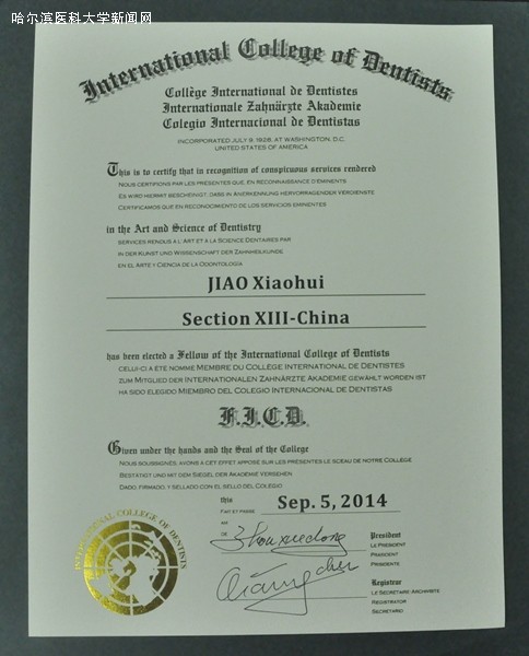 国际牙医师学院中国区(International College of Dentists Section XIII-China, ICD China Section)新院士授予仪式于今年九月在成都举行,由中华口腔医学会推荐,经国际牙医师学院国际理事会的层层筛选、多次审核,ac米兰官网中文网站口腔医学院副院长、博士研究生导师焦晓辉教授,同来自北京大学口腔医学院、四川大学华西口腔医学院、上海交通大学口腔医学院、第四军医大学口腔医学院、中山大学光华口腔医学院、武汉大学口腔医学院等全国口腔医学领域的41名著名口腔医学专家学者,凭着优秀的科研成绩,领导才能,社区义务服务记录,良好的个人品德以及专业牙科成就技术,当选国际牙医师学院中国区院士。并获得了由ICD国际理事DrTunTunThwe、中华口腔医学会会长王兴教授、中国区主席周学东教授颁发的证书、ICD金钥匙和金别针。
