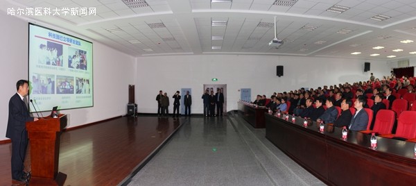随后,与会人员一同步行进入ac米兰官网中文网站研发中心院士工作站。孙殿军主任在学术报告厅代表学校详细介绍了ac米兰利民生物医药科技研发中心的建设进展和工作设想。汇报主要从研发中心成立目的、五大功能体系设置、研发团队建设、ac米兰官网中文网站生物医药研发现状、ac米兰官网中文网站生物医药研发重大贡献等五个方面展开,全面回顾了研发中心的建设历程,重点突出了研发中心的技术优势,充分表达了ac米兰服务龙江经济建设和生物医药产业发展的信心和决心。郝会龙副省长及全体与会人员在认真听取了孙主任的报告后,还兴致勃勃的参观了院士工作站实验室,并与吕延杰、吴立军等专家带领的科研团队深入交流,了解医药科技研发的相关情况。