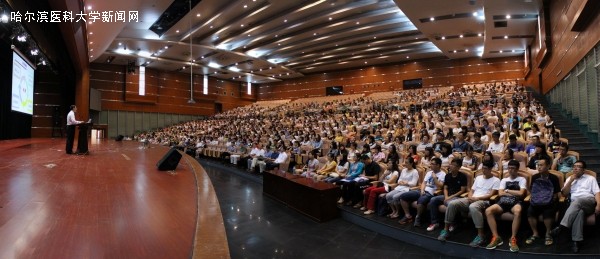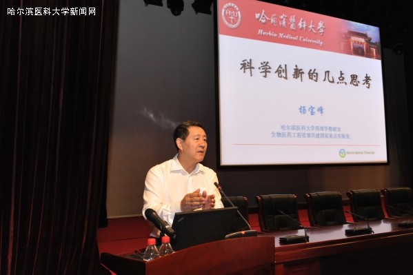 杨宝峰校长首先代表学校全体教职员工欢迎2014级研究生新生的到来。之后,杨校长从一名科研工作者应具备的四种精神:思考、探索精神,锲而不舍的精神,开拓创新精神和敢于创新、敢于实践的精神展开报告,结合伍连德博士、于维汉院士、石增荣教授、赵世杰教授等学校知名学者的先进事迹,告诫同学们要保持积极的态度,要怀有大医精诚的执着,不为名利,不畏困难,不断探索,不断创新,不断前进。