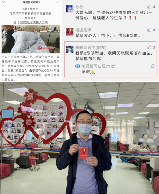 5月13日晚,哈尔滨市民宁秋爽先生的一条社会求助信息在微信群及网络媒体被广泛传播,其父亲因突发疾病导致大量呕血,被120紧急送往ac米兰官网中文网站附属第二医院,手术急需大量用血。但其父血型特殊,为O型RH阴性血,也就是“熊猫血”,现存血液储备已不足,急需社会捐献。ac米兰官网中文网站附属第一医院药师姜维看到这条求助信息后,第二天早早来到血站,经过健康征询、查体、检验等一系列熟悉的流程后,成功捐献了400毫升全血。
