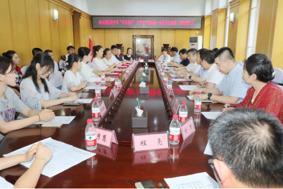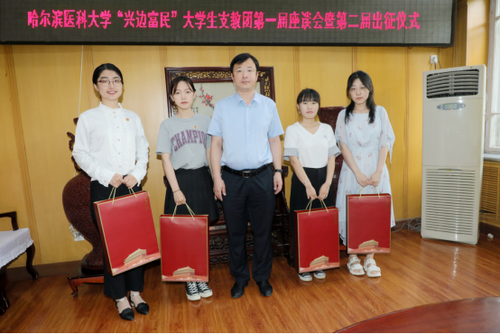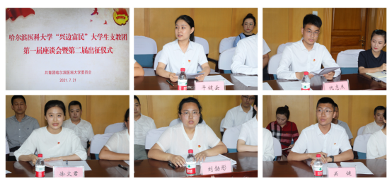 第一届支教团成员依次发言。第一临床医学院2020级眼科学硕士研究生,支教于穆棱市职业技术教育中心学校的于健云说到:在支教度过的每一天,都是自己与青春共同成长的过程,在教学岗位上,给学生更多的知识、更多的爱和更多的自信,让他们羽翼丰满,在走上社会之后展翅高飞。第四临床医学院2020级麻醉学硕士研究生,支教于漠河市实验学校的仇志杰说到:承担的主要科目是住宿生晚自习课堂、幼儿园校医岗、学校食堂部分后勤工作以及幼儿园信息技术提升2.0项目,并表达能成为一名支教教师,是他做得最勇敢的选择,支教生活所焕发的光芒将照亮自己今后的人生道路。第二临床医学院2020级超声医学硕士研究生,支教于漠河市高级中学的徐文君以我心践行医者仁心、以恒心坚守师者本心,主动承担了校医及语文、英语教学岗位,尽自身之力传播医学知识的同时,也始终鼓励自己严守师德、对学生言传身教,得到了学生们的高度认可。第二临床医学院2020级妇产科学硕士研究生,支教于穆棱市共和乡共和中心学校的刘勃彤根据学生的不同情况因材施教,同时结合自己的医学知识,将医学科普小讲堂搬进教室,让医学走入孩子们的日常生活中,使学生们受益良多。第一临床医学院2020级儿童口腔医学硕士研究生,支教于穆棱市共和乡共和中心学校的关健结合自身医学专业的特点,开展了多课时的医学保健科普,同时利用工作日的晚上和周末无偿为初一的孩子辅导数学和英语,他表示自己将25岁青春这一年,最好的自己与最饱满的爱留在了支教服务地,此生无悔。