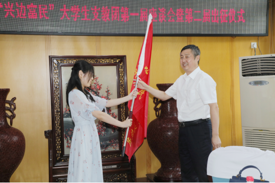 袁重胜为第二届支教团授旗,赵光为第一届支教团成员颁发荣誉证书,许超千为第二届支教团成员出征赠送纪念品。