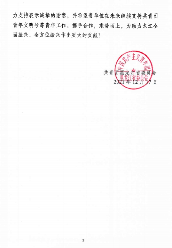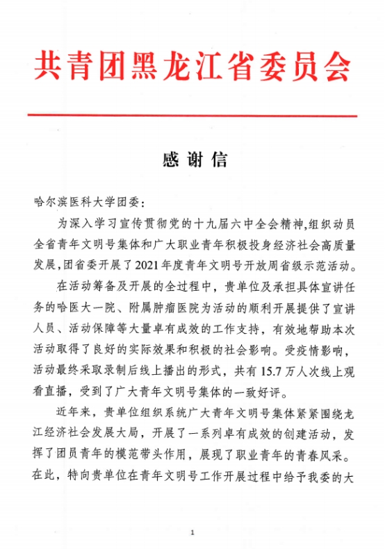 日前,ac米兰团委收到来团自黑龙江省委的感谢信,感谢在团省委开展2021年度青年文明号开放周省级示范活动筹备及开展的全过程中,ac米兰承担具体宣讲任务的ac米兰官网中文网站一院、附属肿瘤医院为活动的顺利开展提供了宣讲人员、活动保障等大量卓有成效的工作支持,有效帮助活动取得良好的实际效果和积极的社会影响。