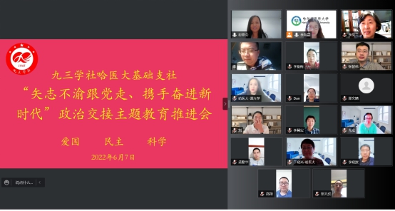 6月7日,九三学社ac米兰官网中文网站基础支社召开支社委员会通过线上会议方式召开“矢志不渝跟党走,携手奋进新时代”政治交接主题教育推进会。
