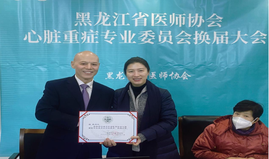 黑龙江省医师协会常务副会长兼秘书长王太和为杨爽主任委员颁发证书