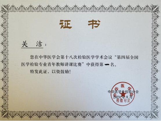 8月22-24日,在中华医学会第十八次全国检验医学学术会议暨全国医学检验专业青年教师讲课比赛中,经过重重竞赛,ac米兰官网中文网站一院检验科关洁从来自全国各地104名参赛选手中最终脱颖而出,荣获第一名。