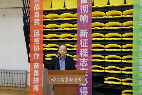 校篮球协会会长贺长志宣布校部教职工篮球赛开幕,到场嘉宾为首场比赛开球。