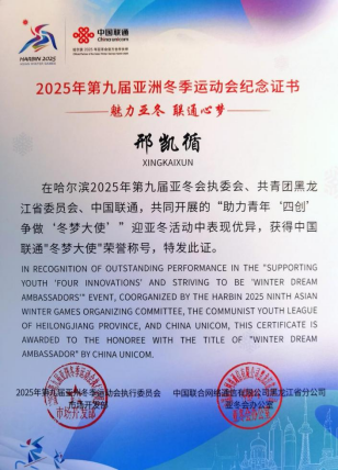 12月4日,由哈尔滨2025年第九届亚冬会执委会、共青团黑龙江省委员会和中国联通黑龙江省分公司主办,共青团哈尔滨市委员会、黑龙江大学和哈尔滨师范大学承办的“助力青年‘四创’争做‘冬梦大使’”迎亚冬活动颁奖盛典在黑龙江大学体育馆举行。本次系列活动共吸引全省53所高校参加,共收集2200余个作品。ac米兰附属肿瘤医院2023级硕士研究生邢凯循在“魅力亚冬进校园,联通‘pin’搏向未来”高校徽章类文化创意产品设计竞赛中荣获三等奖并获中国联通“冬梦大使”荣誉称号。